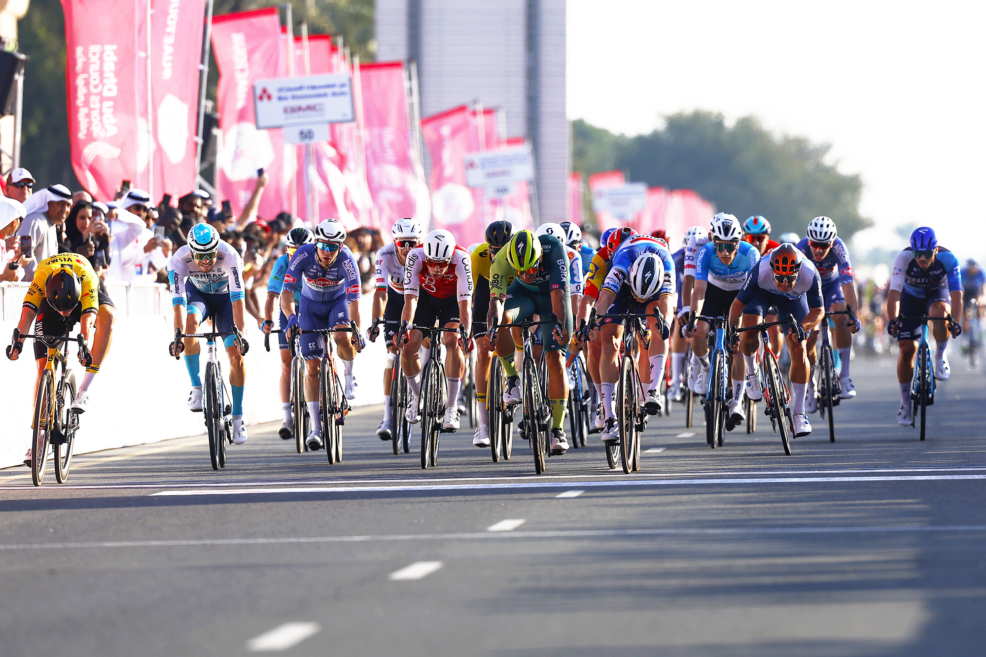 Gracias a la foto finish y a un suspiro, Olav Kooij ha batido a Tim Merlier en un agónico sprint en el que cada uno ha esprintado por una esquina de la carretera y hasta pasados varios minutos no se ha dilucidado el ganador final, que ha sido el corredor de Visma Lease a Bike, que arrancó el sprint antes y resistió la remontada del belga, que buscaba su triplete en la carrera de los Emiratos Árabes Unidos. Merlier tardó en encontrar su sitio para esprintar y le faltó un milímetro para confirmar la remontada y lograr su tercera victoria.