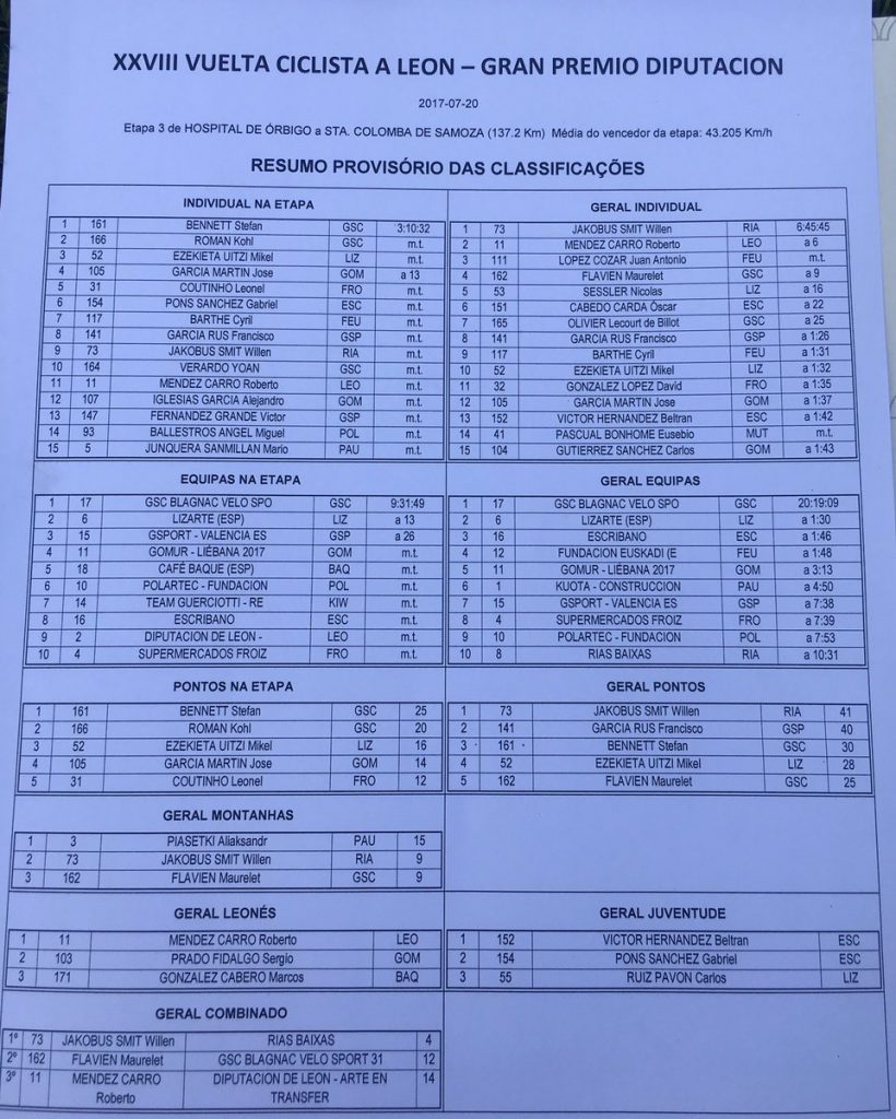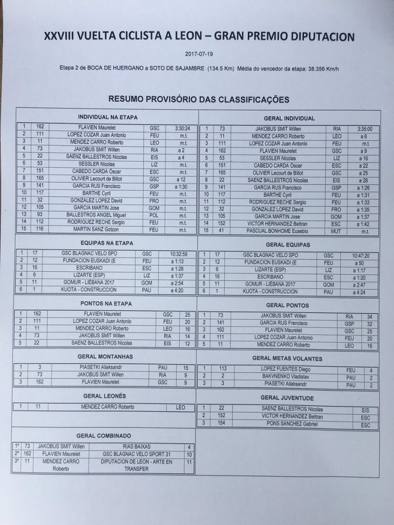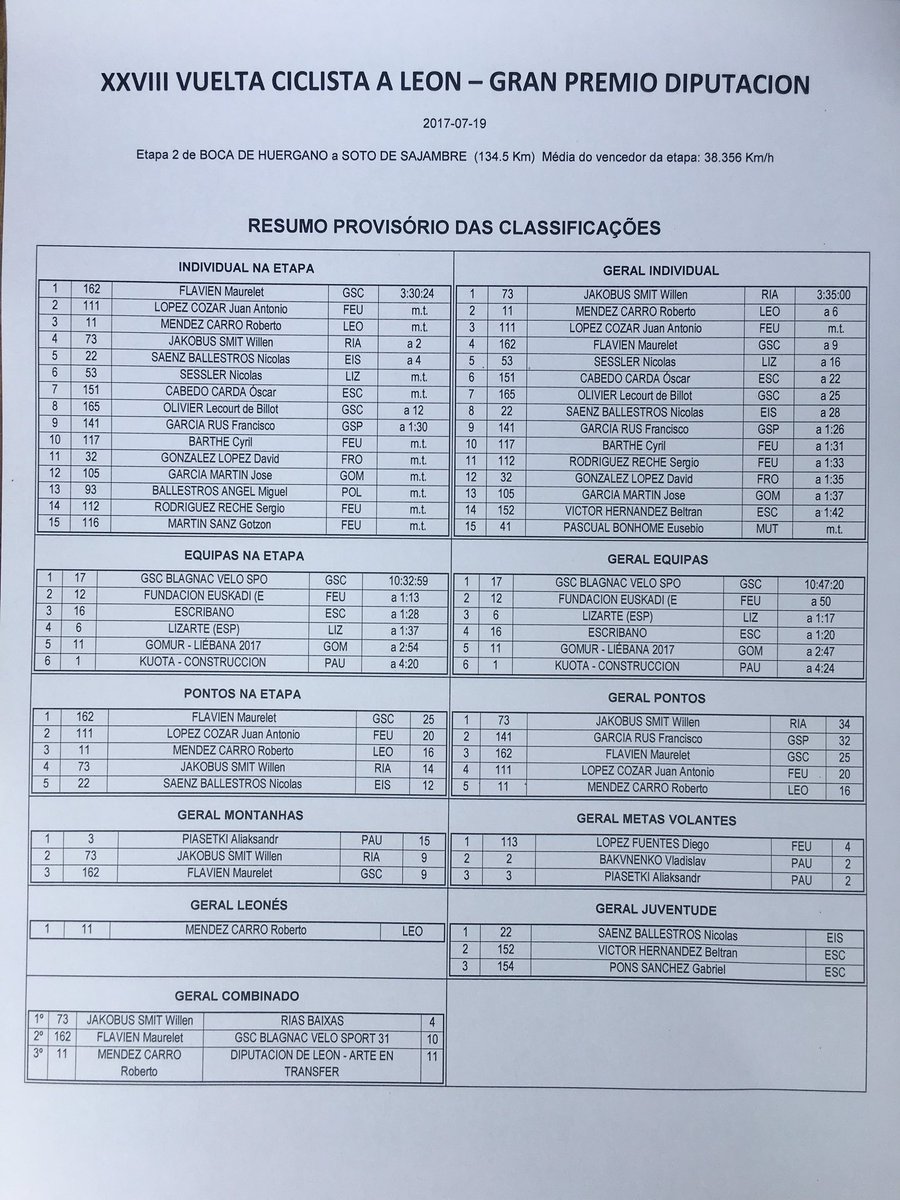 El sudafricano del Club Ciclista Rías Baixas fue alcanzado por siete perseguidores y este grupo se jugó la victoria en la subida final de 2ª categoría. Ganó el campeón francés Maurelet Flavien (GSC), con el mismo tiempo que López Cozar (Euskadi) y Méndez (Diputación de León). A 2″ entró Smit en cuarto posición, mientras que el portador del maillot amarillo Francisco García (Gsport) cedió 1:30. De esta manera, el jefe de filas de la formación miñorana se sitúa líder de la general con 6″ de ventaja respecto a Méndez y Cozar.