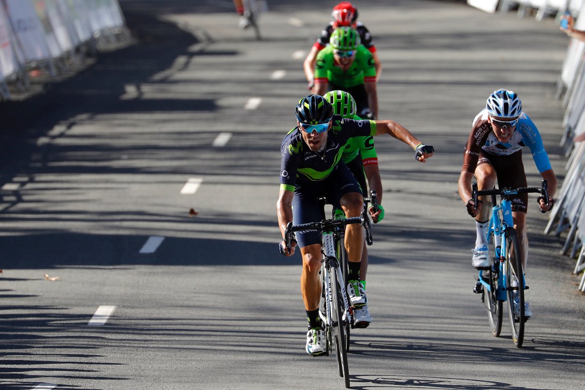 Alejandro Valverde: «En la subida hemos puesto a Rubén a tope desde abajo para marcar el ritmo; ha arrancado Yates y cuando le he visto he probado a acelerar con los favoritos detrás. He probado una y otra vez, conseguía hacer bastante daño, pero era difícil poder irme y en el tramo final de la subida he decidido marcar un ritmo alto, sin atacar, para alcanzar a Woods y Meintjes y poder llegar al sprint, donde sabía que era el más rápido. Conocía el final perfectamente; quien no lo sabe duda en esa última curva si hay que entrar a tope o no. Yo sabía que había que hacerlo, he cogido la punta a 300m de meta y ya no he dejado pasar a nadie. La primera vez que gané entré segundo tras Purito y le pasé en la misma línea de meta, pero sabía que el primero en la curva tenía todas las de ganar. Estoy muy contento por esta victoria, que me hace sentir ya muy satisfecho con lo realizado en esta carrera. Mañana saldremos seguro a tope a la crono, a hacerlo lo mejor posible, sin presión, y si llega la general, será otra más para mi palmarés. No niego que tengo ganas, pues aún no lo he conseguido, pero me iré contento igual. Llevo ocho victorias este año, dos generales, un montón de segundos y terceros puestos… lo que llegue serán alegrías que sumar. Tenemos presente que hay gente muy buena en crono muy cerca de mí: Alberto, que hoy respondió perfecto pese a sus caídas, o Ion, que está a solo 15″ y es un gran contrarrelojista. La clave mañana será tanto la ascensión como el llano tras el descenso. Hay que subir muy rápido y aprovechar la bajada para recuperar todo ese tiempo, porque aunque el tramo posterior es bastante favorable, necesitas bastante potencia para rodar bien. Lo conozco bien, lo reconocimos el viernes pasado, hoy hemos rodado por casi todo su recorrido salvo la subida, y saldré con confianza».