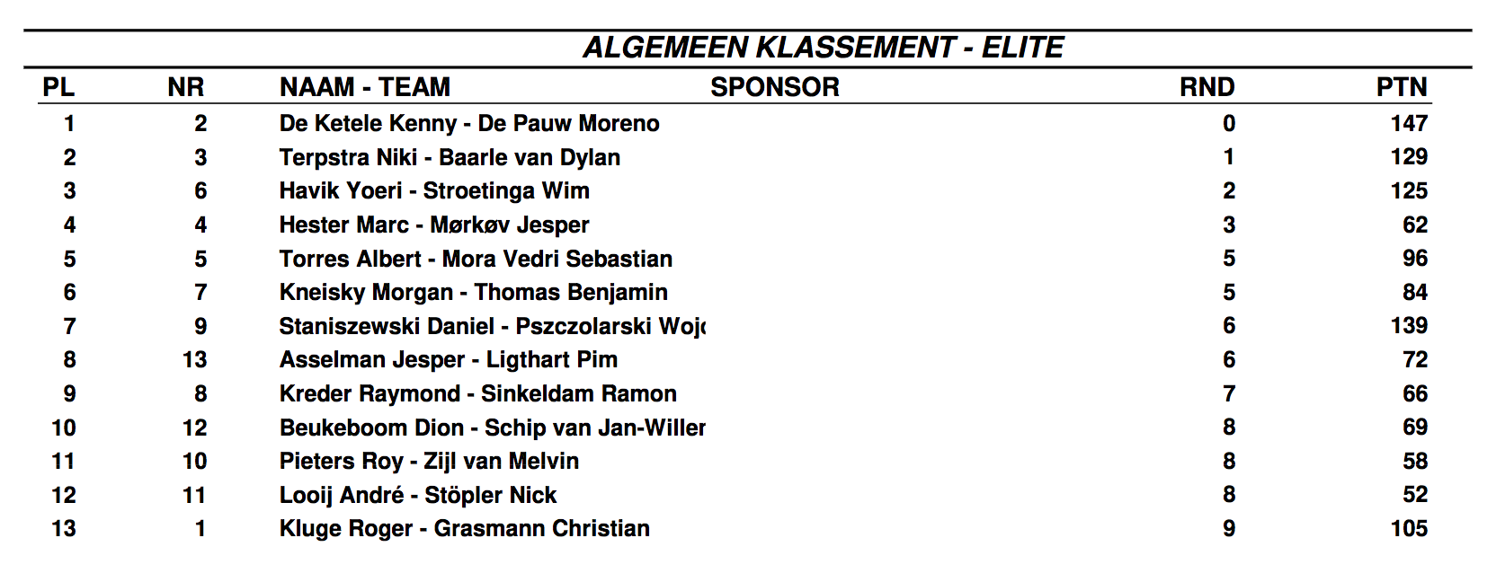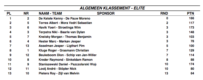Puntos: 1. Asselman/Ligthart 19 puntos 2. De Ketele/De Pauw 13, 3. Staniszewiski/Pszczolarski 13, 4. Kneisky/Thomas 13, 5. Pieters/Van Zijl 10, 6. Torres/Mora 6, 7. Hester/Mørkøv 5, 8. Terpstra/Van Baarle 4, 9. Beukeboom/Van Schip 3, 10. Looij/Stöpler 2, 11. Kluge/Grasmann 0, 12. Kreder/Sinkeldam 0, 13. Havik/Stroetinga 0