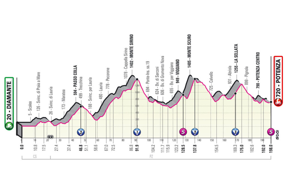 La etapa tiene un desafiante perfil montañoso a través de las montañas de Calabria y Basilicata, con un desnivel acumulado digno de una etapa a través de los Dolomitas. El comienzo junto al mar es el único tramo llano. Después de Maratea, la ruta ondula continuamente, con pendientes más suaves o más duras. Después de subir el Passo della Colla y llegar a Lauria, el recorrido de la etapa aborda un «viejo conocido» del Giro, el Monte Sirino, después de 23 años. Pasado Viggiano, la ruta supera la desafiante Montagna Grande di Viggiano (una subida inédita), y luego toma la ascensión final a Sellata antes de llegar a Potenza