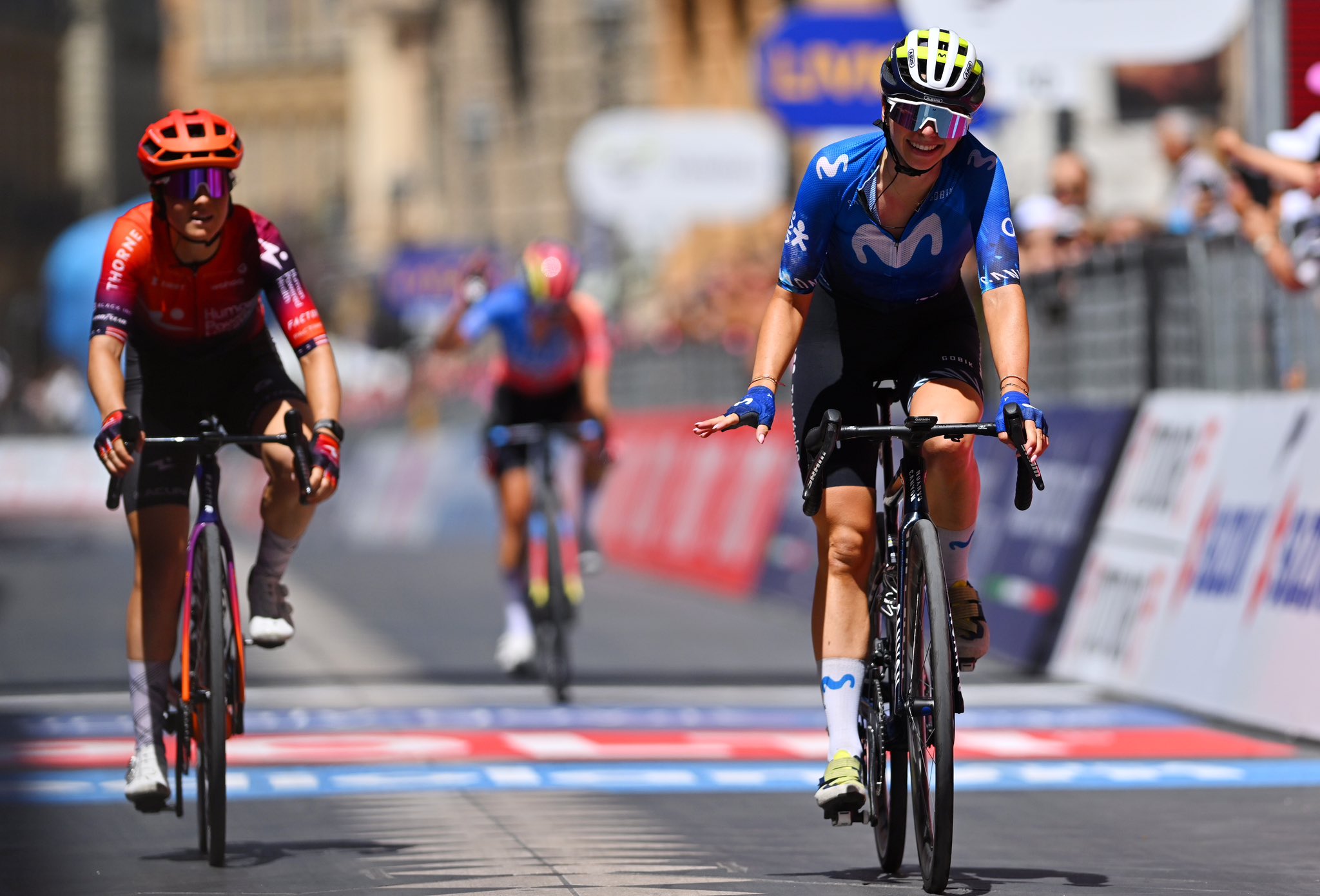 En su temporada más complicada, Liane Lippert sonríe con esta gran victoria en el Giro de Italia. Apartada de la lucha por la clasificación general, la alemana del equipo Movistar se ha movido muy bien en la etapa de hoy para conseguir triunfo de prestigio tras resolver una fuga de enorme nivel ante Ruth Edwards y Erica Magnaldi. En esa misma escapada ha estado Ane Santesteban, sin embargo, se le han resistido las últimas rampas y no ha podido pelear por el triunfo de la etapa.