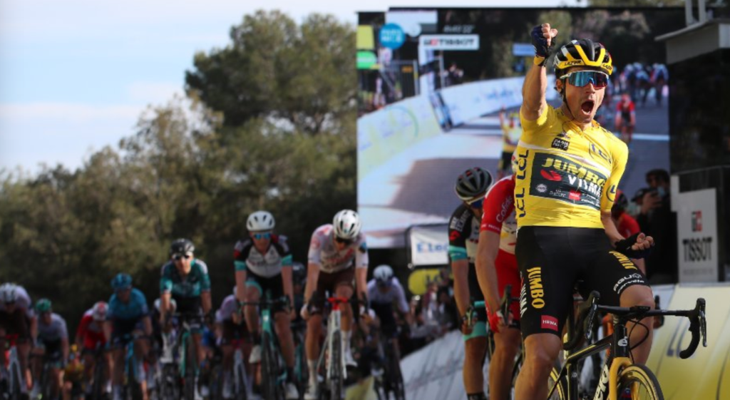 Tras el percance de McNulty y los dos puertos de la ruta, la escapada se fue erosionando. Primer fueron Pérez, y El Fares, después Lutsenko y finalmente, Campenaerts e Hivert para quedarse solo en cabeza un Elissonde con apenas 40 segundos de diferencia. El menudo galo del Trek recibió la compañía del alemán del EF de 197 centímetros, Jonas Rutsch, todo potencia, que pasó a liderar la carrera a menos de 2 kilómetros del final, pero Jumbo y Cofidis no dieron opciones. Tras un primer  medio kilómetro lanzado por Deceuninck sin ariete, a 400 metro atacó Guillaume Martin, pero Roglič cerró perfectamente el hueco para después remachar al francés y no dejar a nadie sobrepsarle. Muy sólidio.