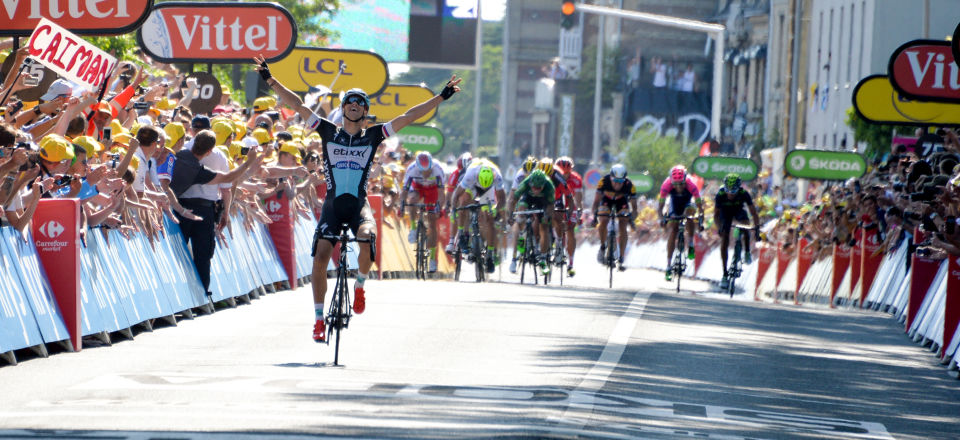 Tras la tregua de la víspera, la jornada circundando Normandía fue otro episodio de tregua tácita entre los favoritos y patrones del pelotón. Y si Stybar fue el más sonriente no le fue a la zaga Daniel Teklehaimanot, que se convierte en el primer corredor africano, eritreo y de raza negra en vestir el maillot de rey de la montaña, despojando a Purito Rodríguez de la prenda. Una situación quizás anecdótica en París, pero brillante para la historia y el desarrollo del ciclismo en aquel país. El espigado corredor del MTN -becado en su tiempo en el Centro Mundial de Aigle, sede de la UCI- se ganó su plaza con el mismo maillot en el Dauphiné y, de momento, está devolviendo la confianza a su equipo -copatrocinado por la empresa de los GPS de las bicicletas– y haciendo feliz a todo un país más acostumbrado a loar atletas de fondo. «Tekle» sabía que tenía la ocasión y se colocó en la fuga del día junto al francés Quemeneur y al belga Vanbilsen, cazado a 3 kilómetros del final. Dos kilómetros después se encendió el bipolar desenlace.