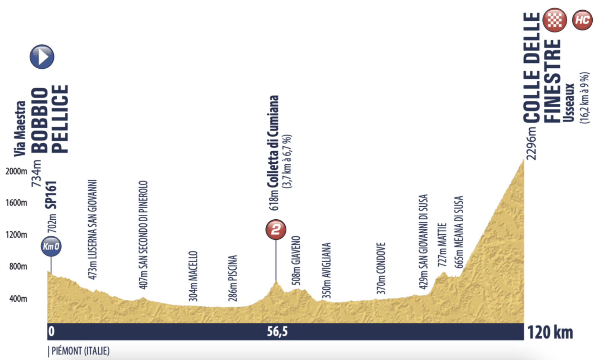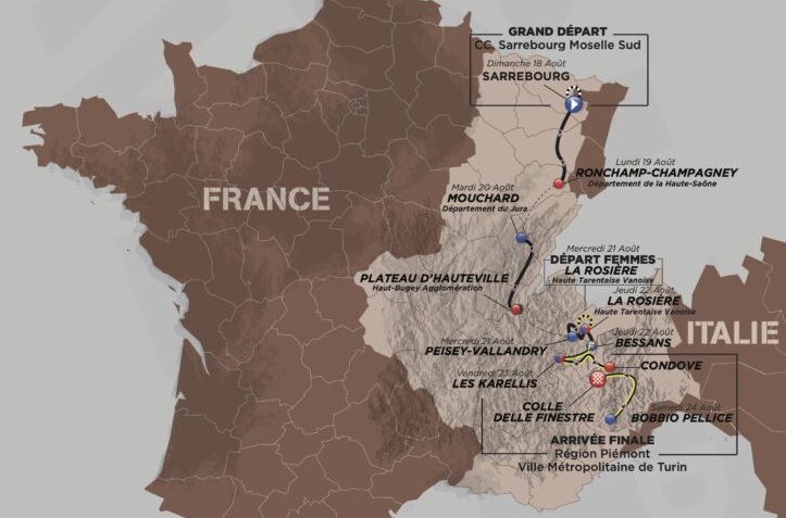 La carrera partirá desde Sarreburgo, donde volverá a celebrarse un prólogo, y finalizará en la vertiente italiana de los Alpes, en la región del Piamonte y en el territorio de la ciudad metropolitana de Turín. Será una edición muy montañosa con varios macizos atravesados con diversos grados de dificultad: Vosgos, Jura y Saboya en la zona Haute-Tarentaise-Vanoise antes de pasar a Italia con una subida final a la cumbre del Colle delle Finestre, con 18 kilómetros, de los cuales los últimos ocho son sin asfaltar.