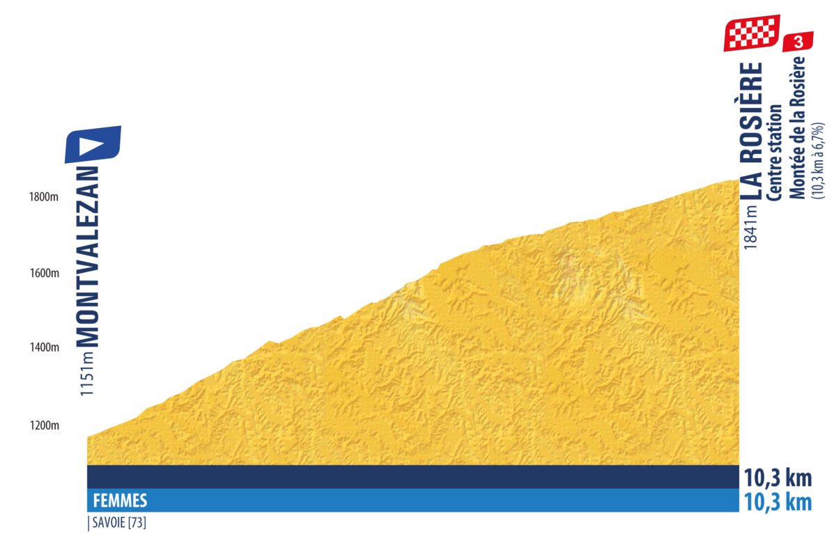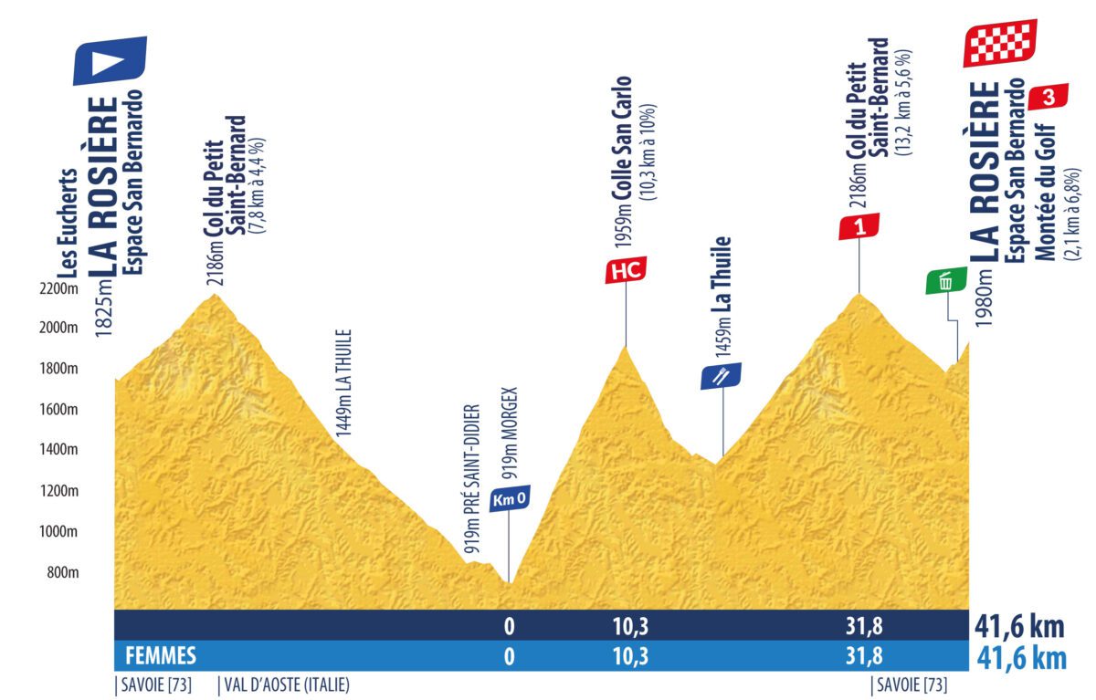 La carrera se abrirá y cerrará con sendas cronoescaladas. La encargada de inaugurar la carrera será la crono de Tignes y contará con apenas 3 kilómetros, mientras que la última podría ser totalmente decisiva, puesto que propondrá 10 kilómetros de ascensión, con más de 700 metros de desnivel, en La Rosiere. Además, esta cronoescalada final será el segundo sector de una jornada en la que previamente se disputará una etapa en línea de 41,2 km, pero con un desnivel brutal tras encadenar las escaladas al Col du Petit Saint-Bernard, Colle San Carlo, de nuevo el Col du Petit Saint-Bernard y el Montee du Golf (La Rosiere).