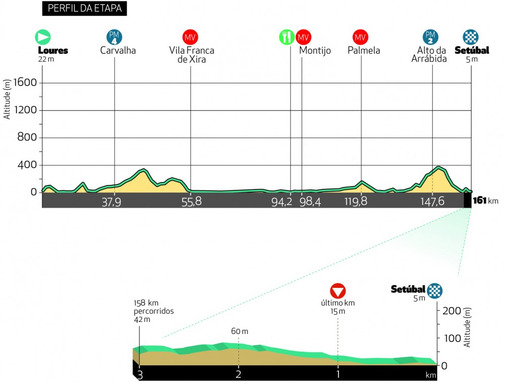 La séptima y penúltima etapa conectará Loures con Setúbal, en un recorrido de 161 km, que se espera sea agitado por el paso en la Serra da Arrábida, una montaña de segunda clase, situada a menos de 14 kilómetros de la llegada, en una invitación al ataque de los hombres. del general.