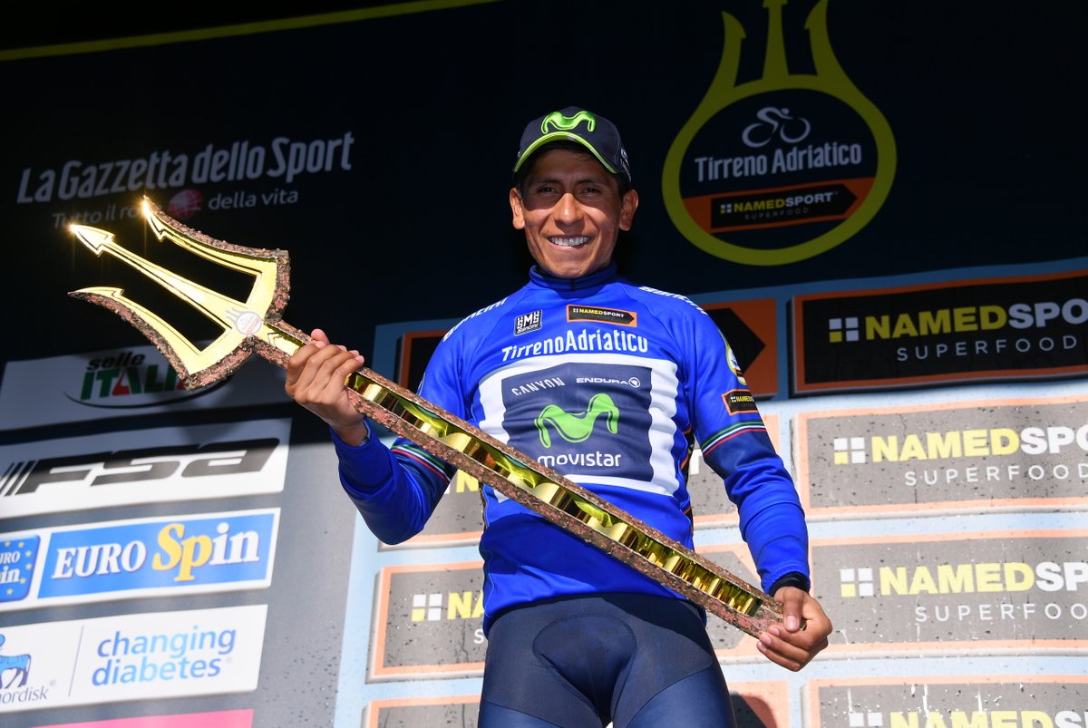 Catorce vueltas y, entre ellas, dos tridentes de la Tirreno Adriático. El primero fue en 2015 y el segundo y de momento último hoy tras un guion similar después de llevarse la etapa reina en la cima del Terminillo. Nairo Quintana (Movistar) prosigue inmaculado su camino hacia el podio final del Giro de Italia, primera parte de su formidable reto que es disputar la corsa rosa y el Tour de Francia -su deuda pendiente- en una misma campaña como ya hizo en 2014. De momento ya acumula este año el éxito en la Volta a la Comunitat Valenciana y en la ronda italiana de los dos mares que vio desde lo alto rodeado del australiano Rohan Dennis -ganador de la cronometrada final- que le birló la segunda plaza al campeón francés, Thibaut Pinot.