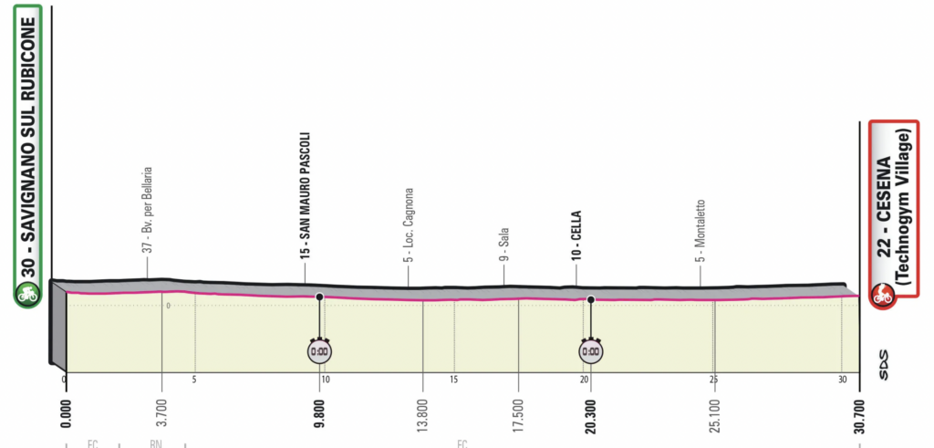 Contrarreloj totalmente plana para los especialistas, con largos tramos rectos conectados por sólo una docena de curvas. Llegada al Technogym Village después de correr por el centro de Cesena.