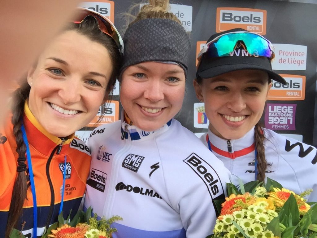 Su compañera del Boels, la británica Elizabeth Armitstead-Deignan y la polaca Katarzyna Niewiadoma (WM3) completan un podio idéntico al de las dos pruebas precedentes.
