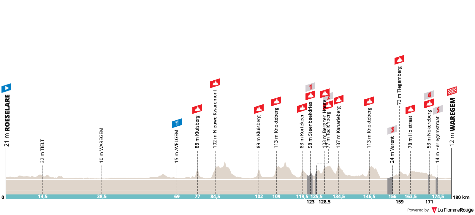 El Kanarieberg está a 45 km del final. Después de la escalada del dúo Taaienberg y Berg Ten Houte, los corredores se dirigirán a Ronse y Kanarieberg hasta la segunda subida del Knokteberg. A través de los adoquines de Varent, se orientarán a las subidas del Vossenhol y el Holstraat para después desplazarse hasta Nokere, con la ascensión adoquinada al Nokereberg, última subida del día en la avenida Herlegemstraat, dirección directa a Waregem.