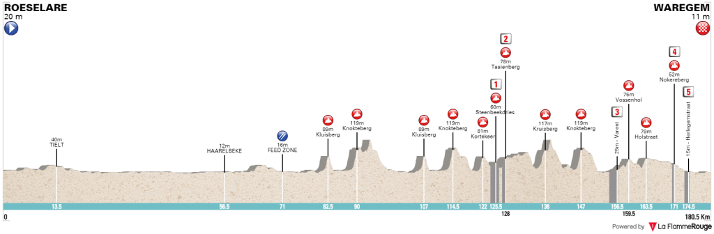 Las subidas comenzarán en el kilómetro 83, cuando se afronte por primera vez la dupla que formarán el Kluisberg y Trieu. Tras ese primer asalto, los corredores volverán a afrontar esa doble ascensión tras sólo 17 kilómetros de descanso. A este segundo paso le seguirán las subidas a Kortekeer (122), Steenbeekdries (126), Taaienberg (128) y Kruisberg (138). El tercer paso por Trieu (147) inaugurará la ración final de ascensiones en las que el pelotón transitará por Vossenhol (159), Holstraat (164) y Nokereberg (171), a sólo diez kilómetros de la línea de meta. A todo ello, habrá que sumar tres tramos adoquinados, de los que el último estará situado en el kilómetro 174, a sólo siete kilómetros de la línea de meta.