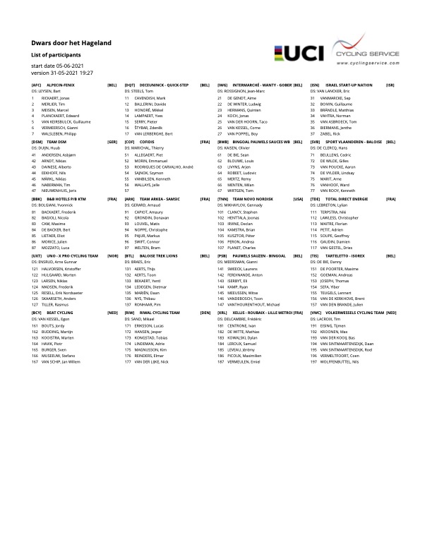 El noruego Rasmus Tiller dio la sorpresa en la semiclásica belga A Través de Hageland (1.1) con tramos de tierra y adoquines. El corredor del Uno-X de 24 años se estrenó en la campaña después de ser el mejor de una escapada generada a 50 kilómetros del final rematando en la subida adfoquinada a la Ciudadela de Diest. Danny van Poppel (Intermarché) e Yves Lampaert (Deceuninck) completaron el podio por dleante del dorsal 1 Jonas Rickaert (Alpecin).