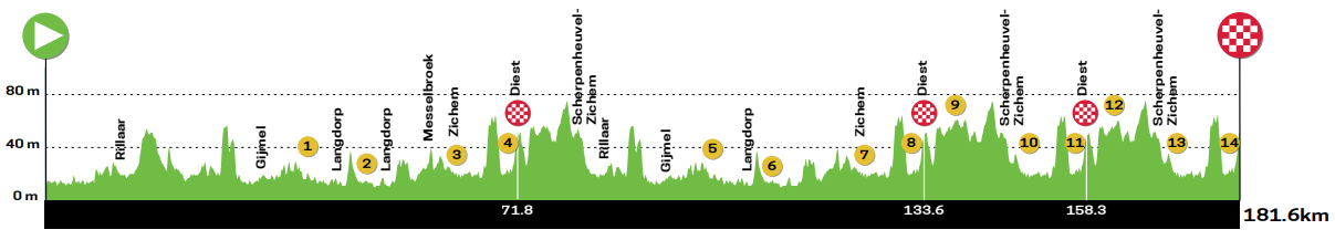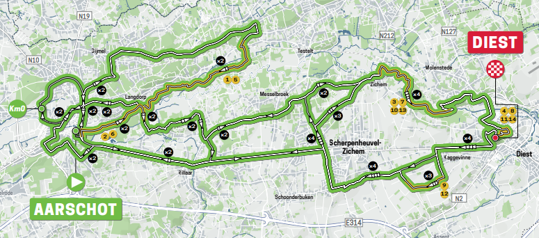 Cinco ciclistas –Jens Reynders (Sport Vlaanderen), Ward Huybs (Baloise – Trek), Kobe Vanoverschelde (Tarteletto), Thomas Joseph (Minerva) y Simon Daniels (Geofco-Doltcini)- conformaron la fuga del día, logrando una renta máxima de apenas dos minutos y medio tras el primer paso por meta, momento en el que el pelotón levantaba el pie y les dejaba marchar. Pero esta situación no duró mucho, puesto que Lotto endureció el ritmo en el primer enlazado de Grootbroekstraat y Demervallei Aarschot, dos largos sectores de tierra. Este cambio de ritmo acercó al grupo a los fugados, pero los continuos movimientos impedían finalizar la caza. Connor Swift (Arkéa) y Tom Devriendt (Intermarché) lo intentaban enfilando al grupo, hasta que a 50 kilómetros de meta, los cinco de cabeza eran absorbidos por el pelotón, donde también lo probaba Tim Wellens.
