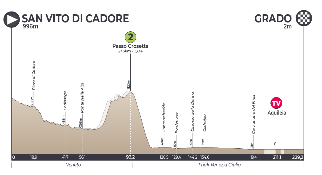 El primer grupo que marchó en fuga fue el de Jhonatan Narváez (Quick-Step), Floris Gerts (Roompot), Floryan Arnoult (Trevigiani), a los que se unieron Enrico Logica y Giovanni Pedretti (Biesse), Yukiya Arashiro (Bahrain) y Antonio Di Sante (Sangemini). En la ascensión al Rolle cedieron Arnoult y Pedretti. Tras coronar Pedretti y Di Santi en cabeza, en el descenso se unieron Narváez, Arashiro y Gerts más los nuevos Fabio Felline (Trek), Marco Frapporti (Androni) y Michele Gazzara (Sangemini).