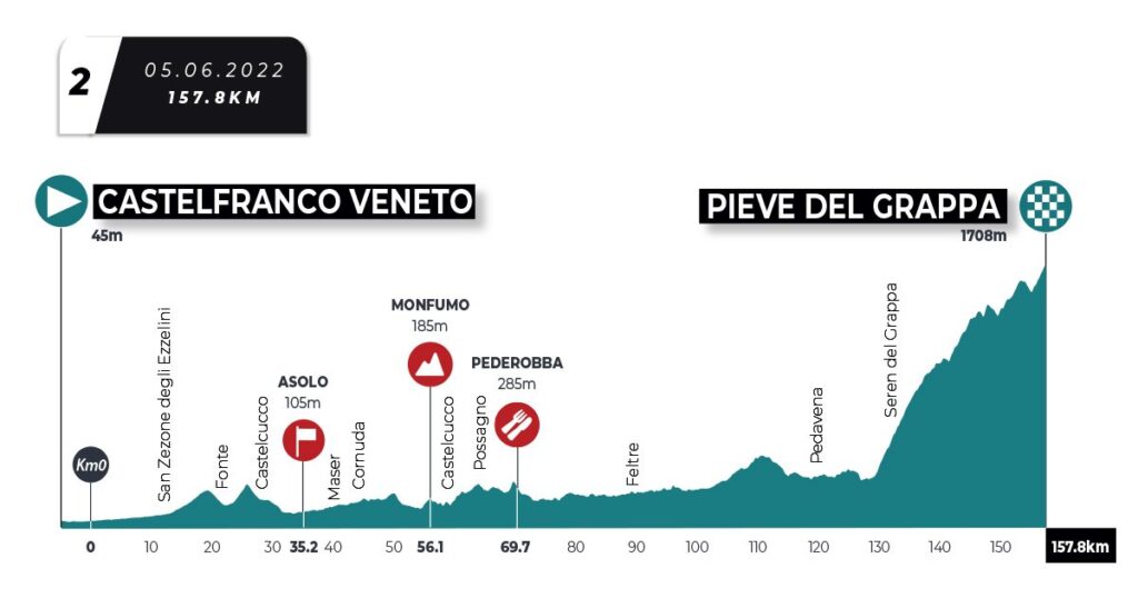 La carrera italiana ha desvelado el recorrido de las cinco etapas, entre las que destaca la segunda, con llegada en alto. El domingo 5 de junio la carrera recorrerá la zona del Véneto, con salida de Castelfranco Veneto y conclusión en la cima del Monte Grappa donde en 2021 Lorenzo Fortunato fue el ganador. «Tras el éxito de este hito el año pasado, hemos querido volver a proponer la meta en la cima de lo que para todos los aficionados a las dos ruedas es un pico mítico. Ya puedo anticipar que este año subiremos por un lado diferente al del año pasado para permitir a los amantes del ciclismo descubrir un nuevo recorrido lleno de belleza e historia», explicó Moreno Argentin.