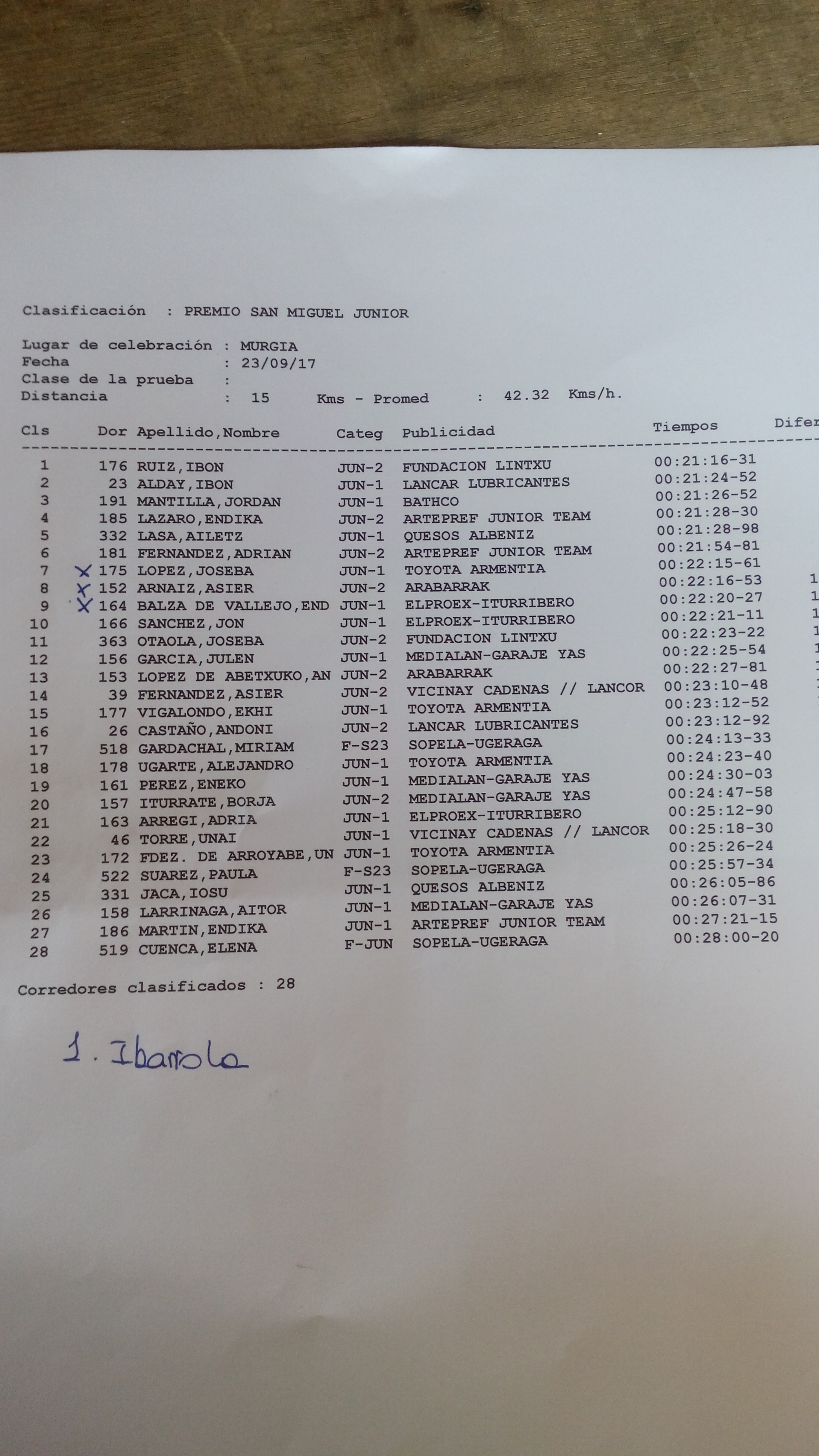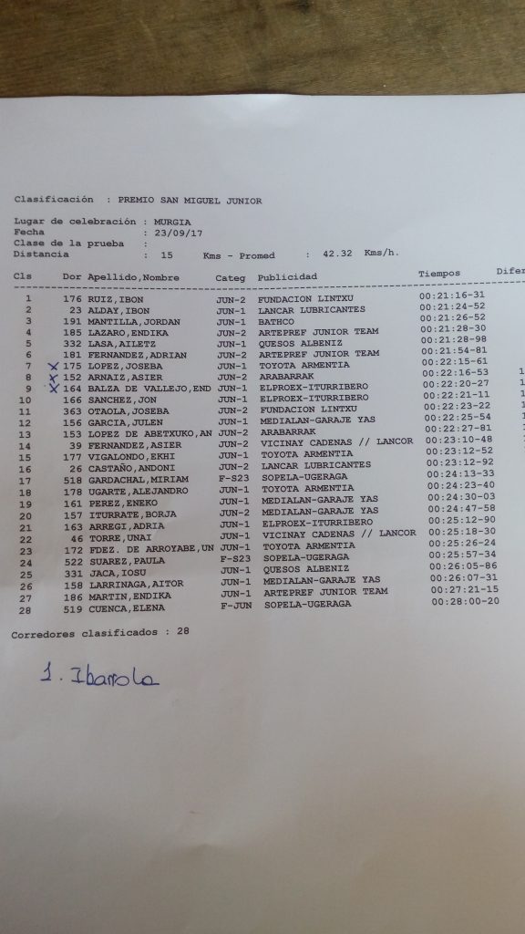 En junior, el vitoriano Ibon Ruiz se alzó con la victoria por ocho segundos de margen sobre Ibon Alday y diez sobre el cántabro Jordan Mantilla. Ruiz se enfundó el maillot de campeón provincial por delante de Joseba López, que fue séptimo en la prueba, y Asier Arnaiz que se colgó el bronce, gracias a su octavo puesto. Los 15 kilómetros de recorrido dieron lugar a ciertas ventajas entre los ciclistas, pero a partir del quinto puesto. Hasta dicho lugar el podium se resolvió en doce segundos.