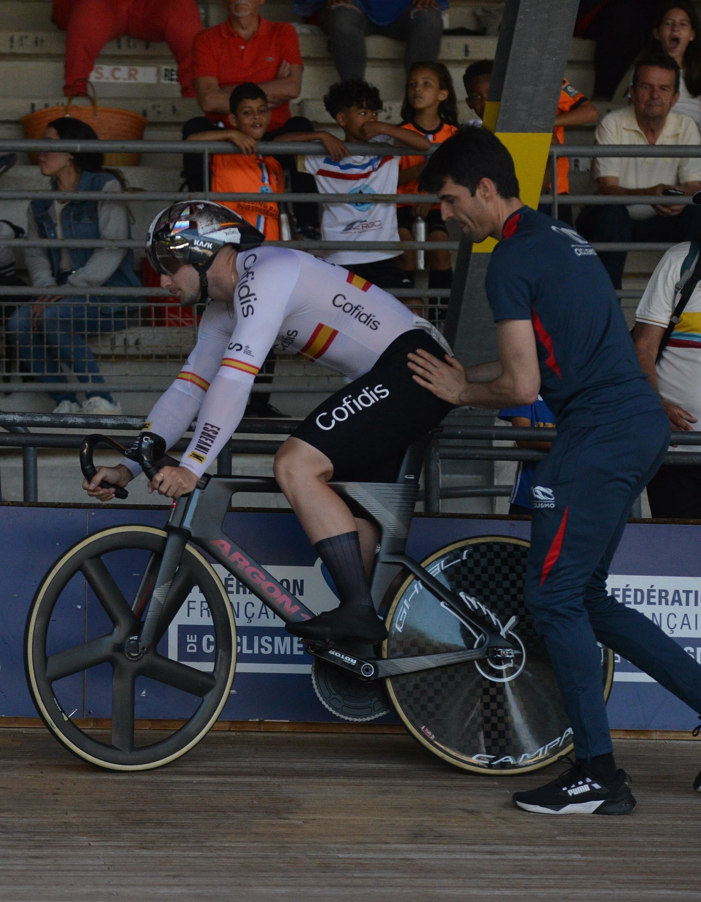 Por ese motivo, se llegó a la decisión de cambiar su posición en el equipo de velocidad, con el fin de recudir esa posición tan agresiva. «La idea es que fuera de dos, aunque también podría hacerlo incluso de tres. Pero hicimos una prueba en Valencia, en 18.2, bajando luego una décima. El problema era que Esteban (Sánchez) cogiera bien la rueda y lo resolvimos cambiando los desarrollos, poniendo yo una punta más y quitándosela él. En un velódromo de madera como el de allí estaré bastante por debajo y si Esteban me coge bien la rueda, ya el tercer relevo con Pepe (Moreno) no hay problema porque siempre es un seguro».
