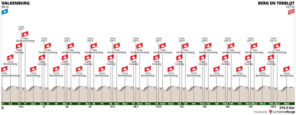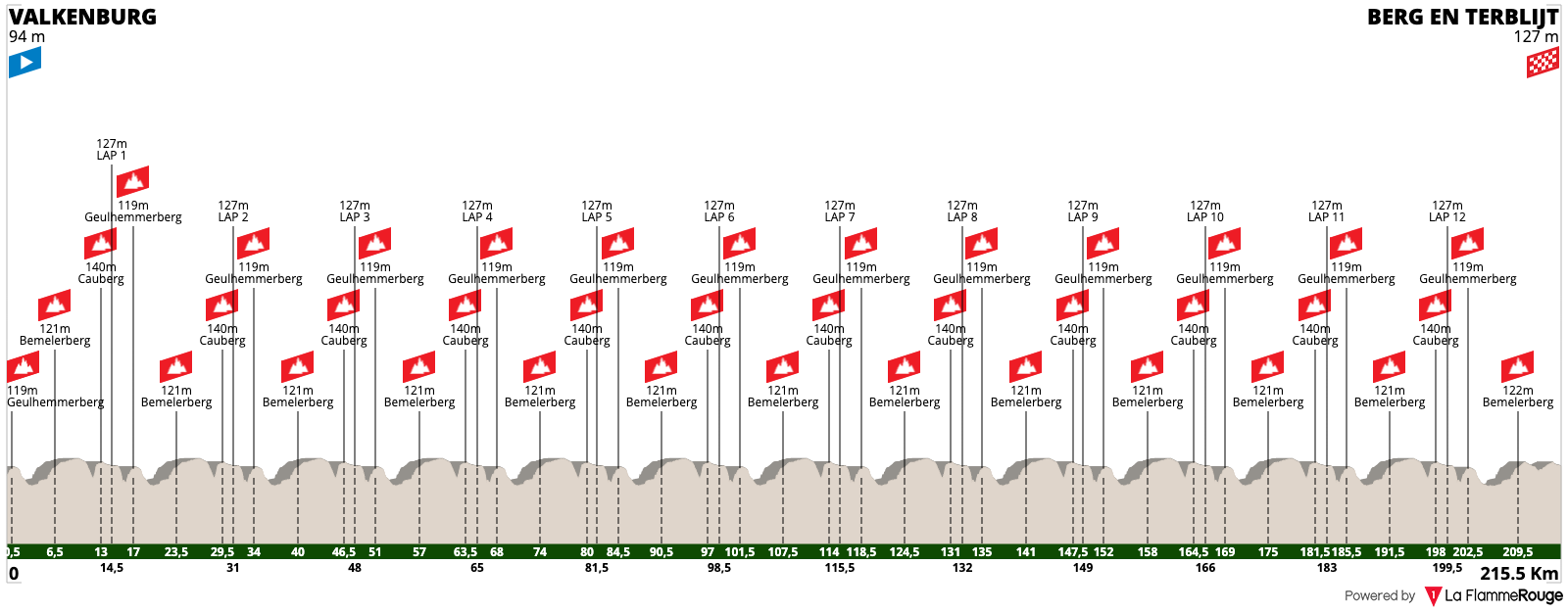 Un activo Ide Schelling volvió a poner en marcha el pelotón, pero las diferencias siguieron siendo pequeñas y el gran grupo siguió siendo bastante numeroso. Schelling alcanzó a Vliegen a 25 kilómetros de la meta y subieron el Bemelerberg a la par. Después de esa subida, el UAE se puso a la cabeza de la persecución, pero Schelling comenzó la última vez en el Cauberg con una pequeña ventaja, ya en solitario. No duró mucho porque Wout van Aert atacó. Todos los favoritos tenían que reaccionar y la mayoría lo hizo pero su «peón» en el día de hoy tuvo que bajarse de su bicicleta para resolver una salida de cadena que le eliminó de la disputa.