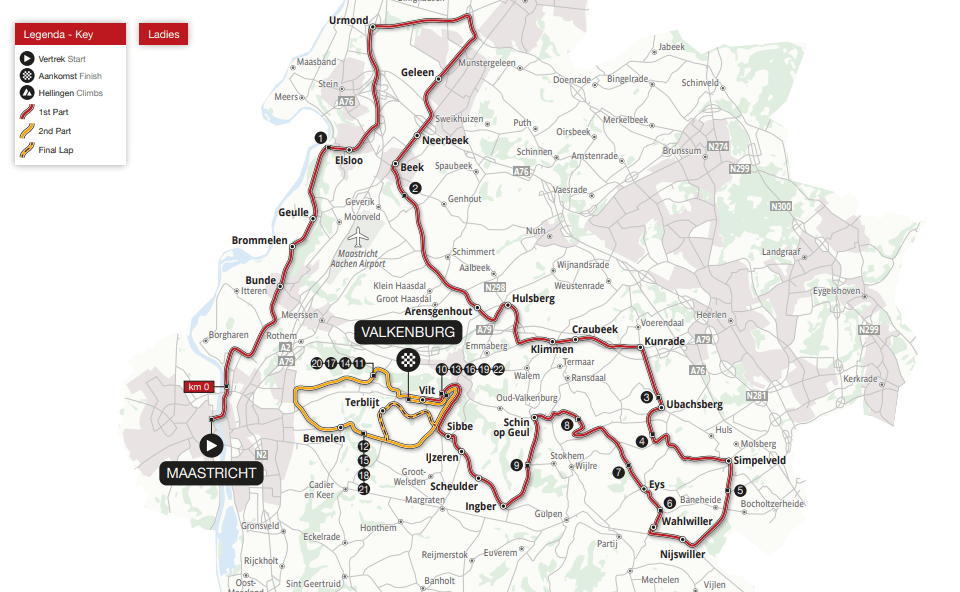 La carrera cubre una distancia total de 157 kilómetros. Al igual que el año pasado, el recorrido no sólo es más largo sino también más desafiante. El conocido bucle final de 18 kilómetros, con Geulhemmerberg, Bemelerberg y Cauberg, se completará cuatro veces en 2025. Una novedad este año es que la carrera femenina pasará por la avenida Mathieu van der Poel en la final, antes de descender por Daalhemerweg antes de comenzar la subida final al Cauberg.
