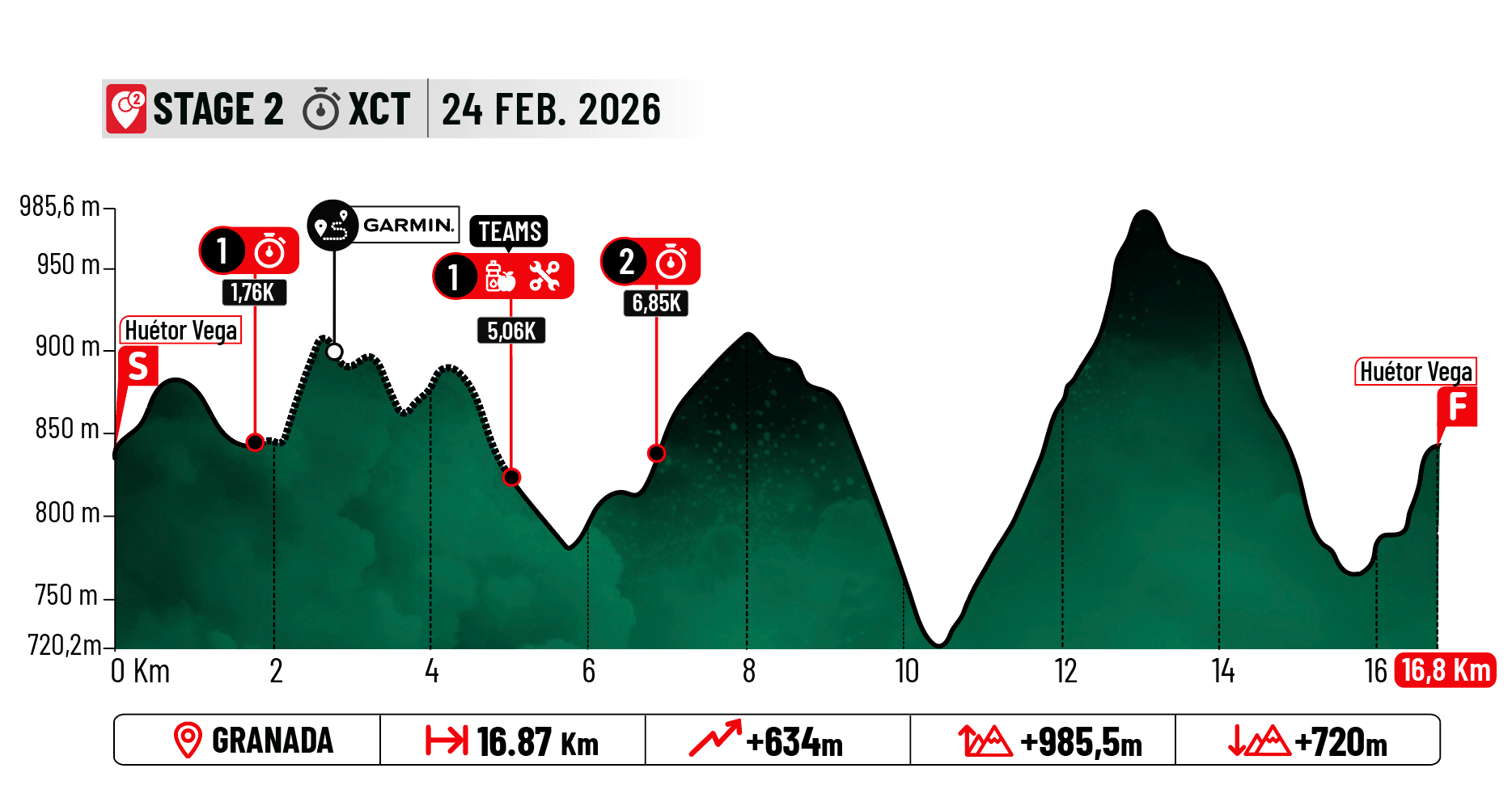 Contrarreloj con salida en Cenes de la Vega, junto al río Genil, para afrontar de inmediato la subida más dura del día enlazando el Barranco de las Mansiegas con el Camino de los Neveros. Desde arriba, descenso rápido y fluido por sendero hacia Monachil y luego Huétor Vega. Allí empieza la parte más técnica y espectacular: un circuito casi completo de puro XCO con subidas muy duras, senderos técnicos, zigzags y rock gardens.