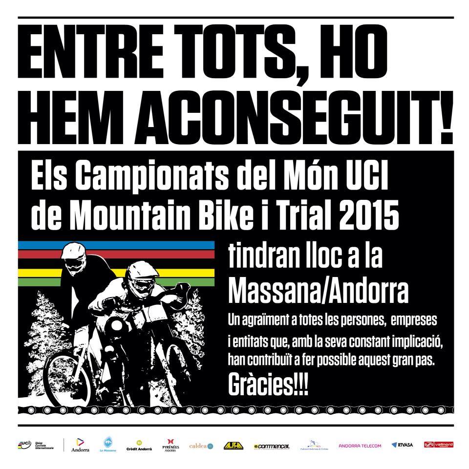 La Unión Ciclista Internacional (UCI), reunida en Florencia con ocasión de los Campeonatos del Mundo de carretera, ha anunciado oficialmente la concesión de los Mundiales de BTT y Trial 2015 a Andorra, que tendrán como sede el sector de Pal de la estación de esquí de Vallnord. Noticia confirmada también por el Comú de La Massana, localidad que alberga el escenario de las futuras pruebas.