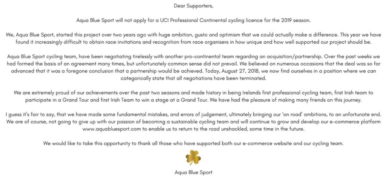La nota reconoce que Aqua Blue Sport ha estado negociando «incansablemente» con otro equipo Profesional Continental con vistas a una adquisición/fusión. «Durante las últimas semanas habíamos sentado las bases de un acuerdo muchas veces, pero desgraciadamente no prevaleció el sentido común. Hoy podemos afirmar que todas las negociaciones han terminado«.