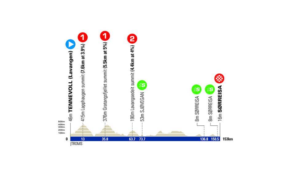 En la segunda etapa, Tennevoll debutará como ciudad de salida, pero los ciclistas ya estuvieron allí en 2015 y 2017. La primera parte del recorrido es bastante exigente. Nada más bajar la bandera, los ciclistas se enfrentarán a la subida de Lapphaugen (7,6 km al 3,9 %), que servirá de trampolín para que los más duros se escapen. No tendrán tregua, ya que el ascenso a Gratangsbotn (5,5 km al 5 %) llegará inmediatamente después y convertirá los primeros 36 kilómetros en un auténtico sufrimiento. El vencedor se coronará en Sørreisa tras completar dos vueltas a un circuito final de 14 km con 1,9 km de carretera gris al 3 %.