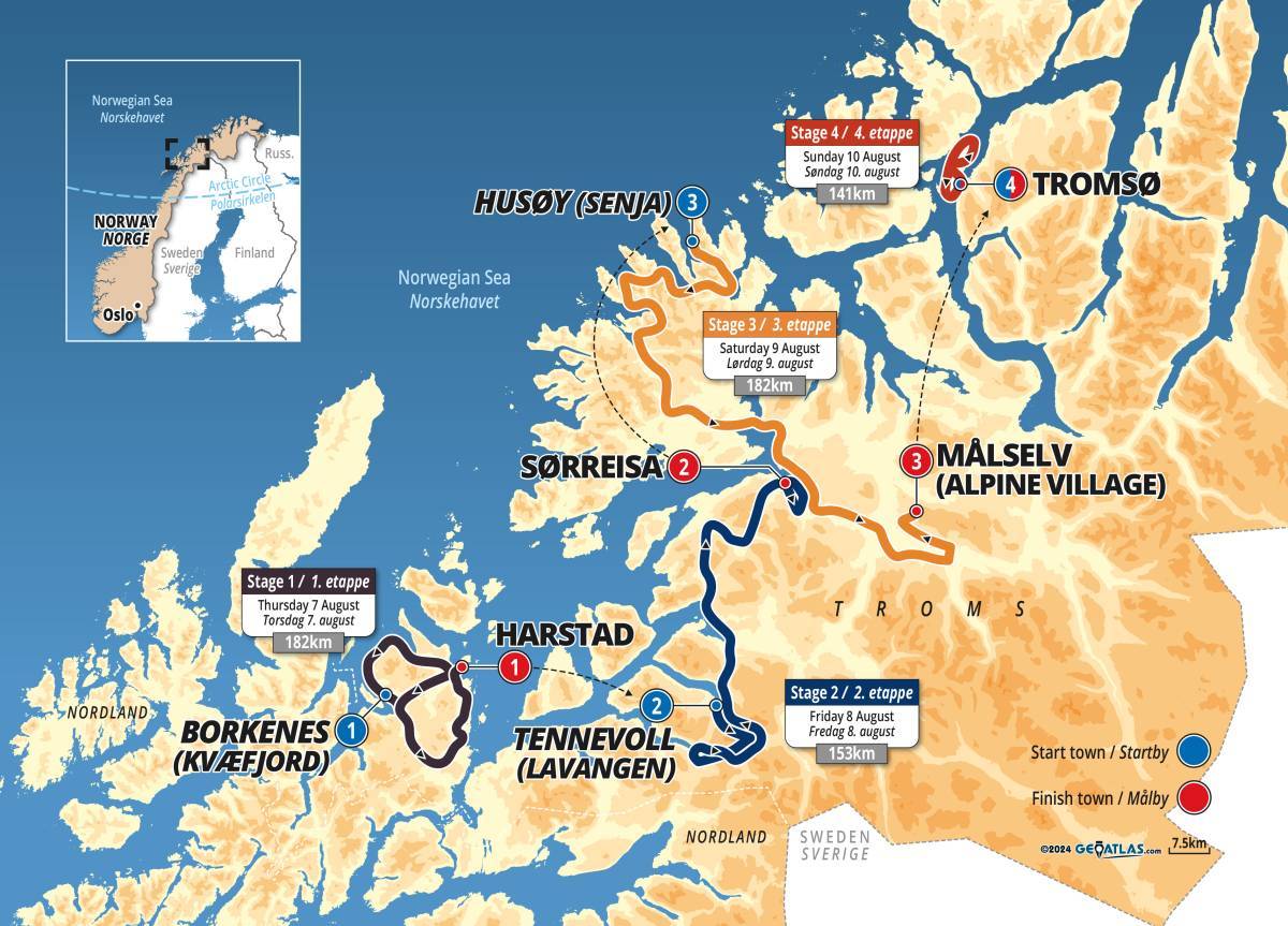 La Arctic Race de Noruega (2.Pro) celebrará desde el 7 hasta el 10 de agosto de 2025 su duodécima edición, regresando más al norte del país, al condado de Troms. La primera etapa llevará al pelotón desde Borkenes, parte del municipio de Kvæfjord, hasta Harstad, en un recorrido que tiene escrito «final al sprint«. Harstad acogerá una llegada de etapa por cuarta vez, después de 2013, 2015 y 2021. La línea de meta, situada en un falso llano al final de un recorrido de 182 kilómetros, dibujará una sonrisa en el rostro del embajador de la Arctic Race of Norway, Thor Hushovd, que se impuso allí en 2013.