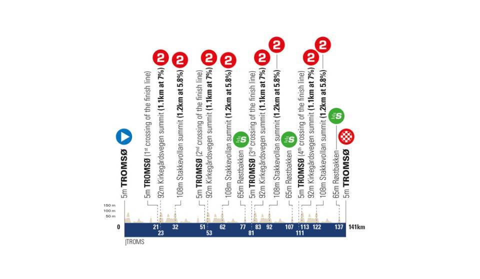 La duodécima edición llegará a su fin en Tromsø. Cinco vueltas a un circuito de unos 30 km de longitud, para un total de 141 kilómetros , convertirán el final en una guerra de desgaste, con ocho subidas que añadirán dificultad. Esta secuencia de dificultades abrirá la carrera de par en par y confirmará el viejo dicho de que la fortuna favorece a los audaces. El recorrido, corto pero frenético, significa que el hombre del maillot sol de medianoche tendrá mucho trabajo por delante para mantener a raya a sus rivales hasta el final.