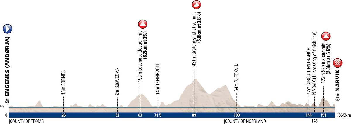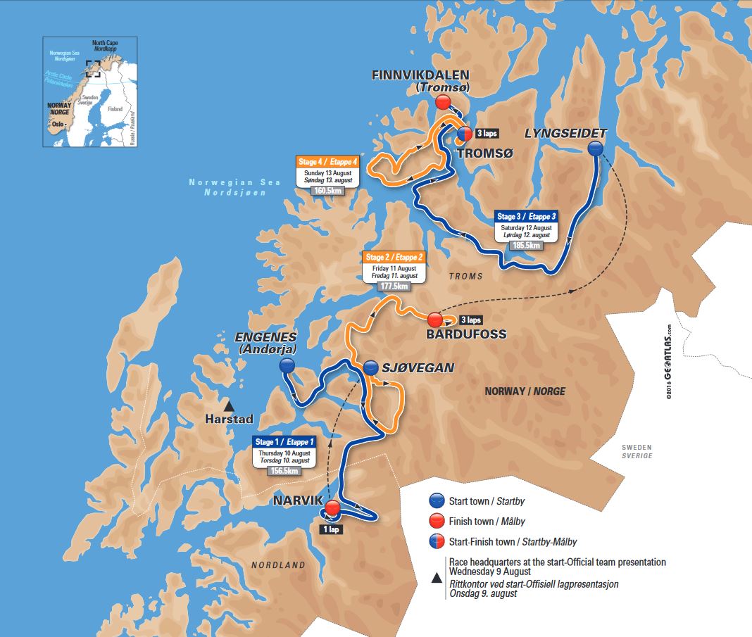 La carrera comenzará el día 10 de agosto con una etapa entre Engenes y Narvik. Con esta etapa la organización quiere rendir homenaje a las raíces sobre las que se sustenta esta prueba, de categoría .HC, ya que fue en la isla de Andørja, en la que se encuentra enclavada Engenes, donde comenzó a fraguarse, gracias a la disputa del Tour de Andørja, la idea de poner en marcha una carrera del más alto nivel en estas latitudes tan septentrionales.