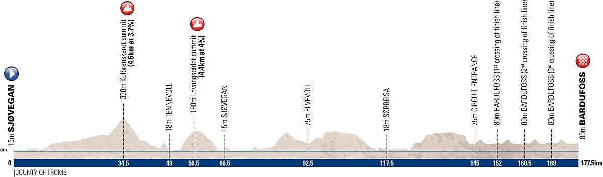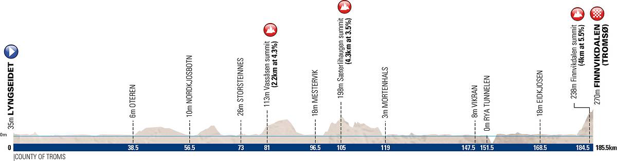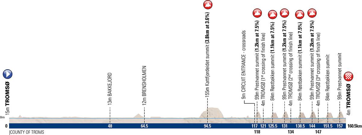 La prueba se cerrará con una jornada de 118 kilómetros con salida y meta en Tromsø con un recorrido completamente llano a excepción de las tachuelas de Prestvannet (1,2 kilómetros al 7,5%) y el Rostbanken (1,1 kilómetros al 7,5%), subidas ambas incluidas en el circuito final de la etapa y que serán ascendidas en tres ocasiones.