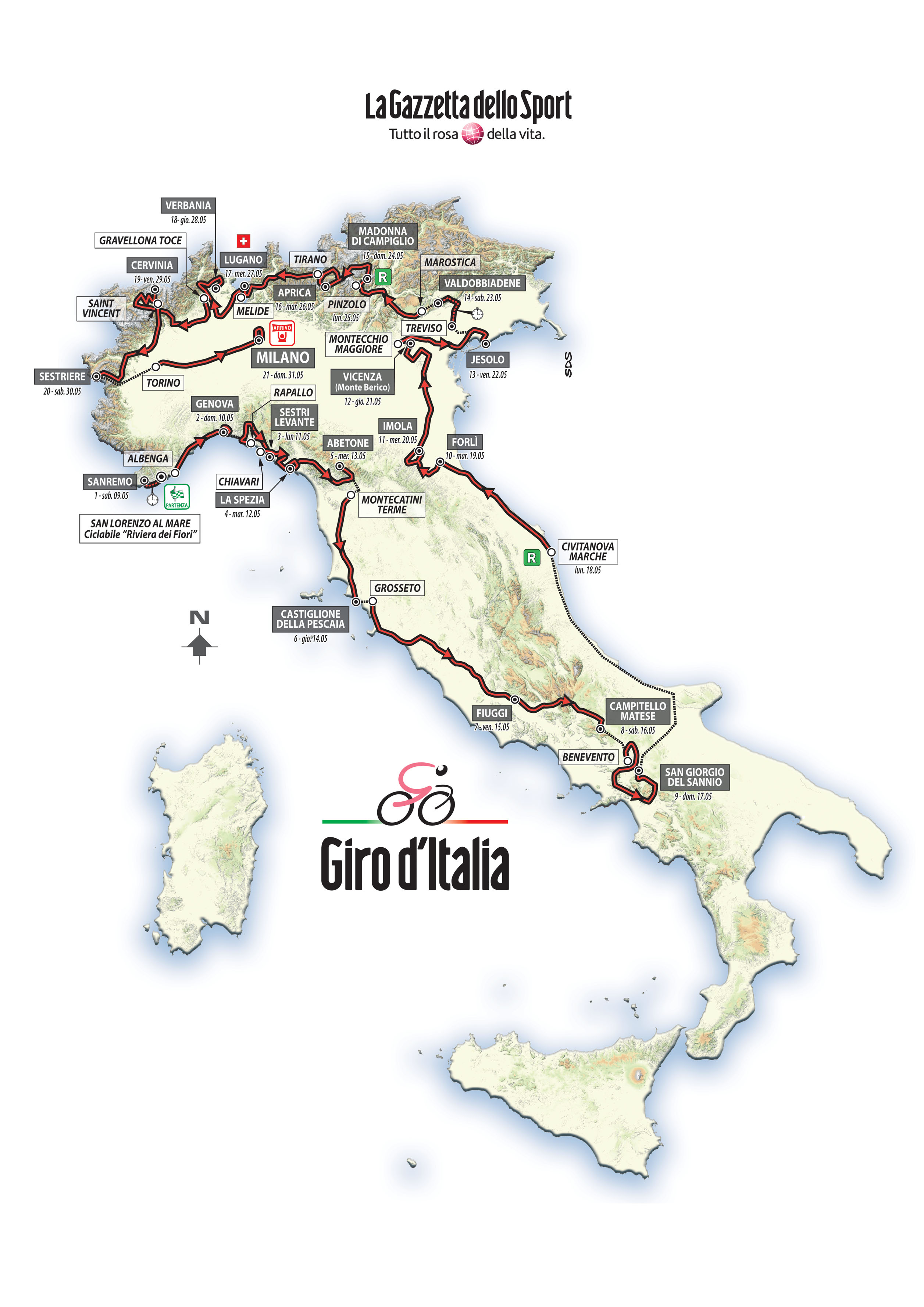 Un recorrido que tiene como claves principales la contrarreloj por equipos inicial de casi 18 kilómetros y, sobre todo, la individual y única de casi 60 en el ecuador de la carrera -14ª etapa previa a Madonna di Campiglio- que puede marcar grandes diferencias. Por contra, se sitúan siete llegadas en alto. Abetone (5ª etapa), Campitello Matese (8ª), la liviana Vicenza-Monte Berico (12ª), Madonna di Campiglio (15ª), Aprica (16ª tras el segundo día de descanso), Cervinia (19ª) y la penúltima de Sestriere marcarán el portador final de la maglia rosa 2015. La Cima Coppi será el Colle delle Finestre (2.178 metros de altitud), mientras que la Cima Pantani será el Mortirolo (1.854 metros), que se subirá en la jornada de Aprica.
