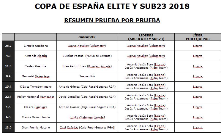 La penúltima prueba, la Clásica Tondo, suponía el triunfo de Dzmitry Zhyhunou, con lo que Lizarte se llevaba ese triunfo parcial al que no había podido conseguir por el trabajo de defensa del liderato de Soto. Y hoy Lizarte que intentó poner la guinda del pastel, aunque tuvo que rendirse ante el trabajo del Caja Rural que remataba con su cuatro parcial.