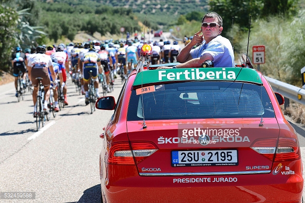 Antes de reunirse en esa sala, cada uno de los cuatro jueces cubre la etapa de manera íntegra en uno de los distintos coches que en más de una ocasión vemos aparecer en las imágenes de televisión dando instrucciones –es la imagen más llamativa para espectador– a los coches y motos que circulan junto a los ciclistas. El presidente, Philippe Marien, viaja siempre (salvo en las etapas de montaña, cuando siempre se situará tras el grupo del líder) en el primer coche que circula detrás del pelotón. Los otros tres se reparten entre la caravana de los directores deportivos y la fuga del día en caso de existir una (y entre los distintos grupos de corredores en las etapas de montaña).