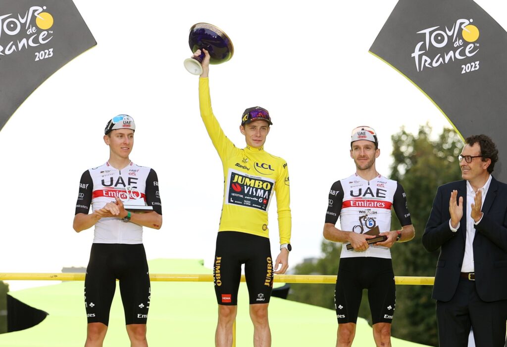 Vingegaard, Pogacar y Yates, en el podio final de París © UCI
