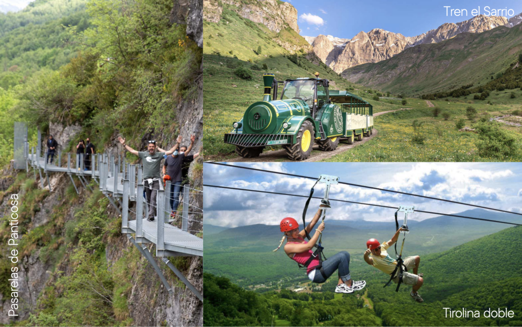 A tan sólo 8 km del Balneario de Panticosa, en el pueblo de Panticosa,encontramos 3 atracciones destacadas para este verano. Las Pasarelas de Panticosa, sobre el Río Caldarés. Unos espectaculares pasos colgantes en la propia pared del congosto en un recorrido de 800 metros que no te dejará indiferente. Un paseo en el tren de alta montaña, El Sarrio, donde podrás llegar al desconocido y maravilloso Valle de la Ripera donde te espera una preciosa red de rutas señalizadas para niños y adultos. Y por último la aventura de subir en el Telecabina de Aramón Panticosa, atravesando frondosos bosques, con las pistas de la estación al fondo y las cimas más altas del valle.A 15 kms del Balneario encontramos el Parque Faunístico Lacuniacha, un lugar donde contemplar los animales en libertad y a 20km, en Hoz de Jaca, otra actividad muy recomendada la Tirolina del Valle de Tena, es la doble más larga de Europa.