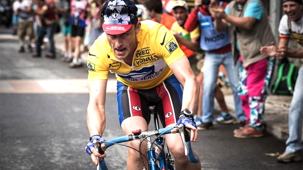 En ella se puede ver a Foster perfectamente caracterizado como Armstrong subido encima de su bicicleta luciendo el maillot amarillo como líder del Tour de Francia.