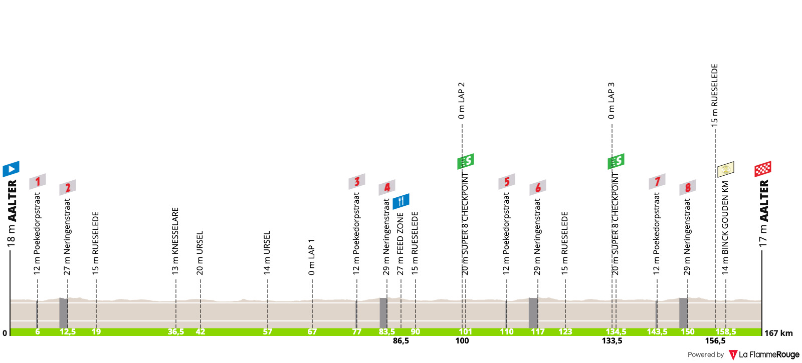 El tramo de adoquines entre Lookhuisstraat e Ichtegem fue el principal obstáculo en el recorrido pero en realidad no representaba mucho, por lo que se podría esperar de nuevo un desenlace al sprint en las calles del municipio flamenco occidental tras 169,1 kms, Ardooie. La escapada del día estuvo compuesta por Josef Černý, Robert Stannard, Jesper Asselman, Thomas Sprengers, Damien Gaudin y Baptiste Planckaert, también fugado en la primera etapa. Los seis lograron una ventaja máxima de 3 minutos siempre bajo el control de los equipos de los velocistas, principalmente el Jumbo-Visma de Dylan Groenewegen más Deceuninck-Quick Step por el colombiano Álvaro José Hodeg, BORA-hansgrohe por el líder de la carrera Bennett y Emiratos Árabes Unidos por el aspirante Jasper Philipsen intentaron cortar el sueño a los seis líderes lo más rápido posible.
