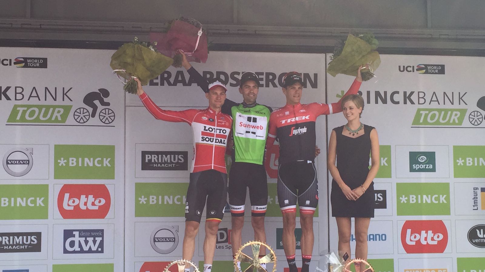 Dumoulin, en el centro del podio final en Geraardsbergen, flanqueado por Wellens y Stuyven © Ciclo21
