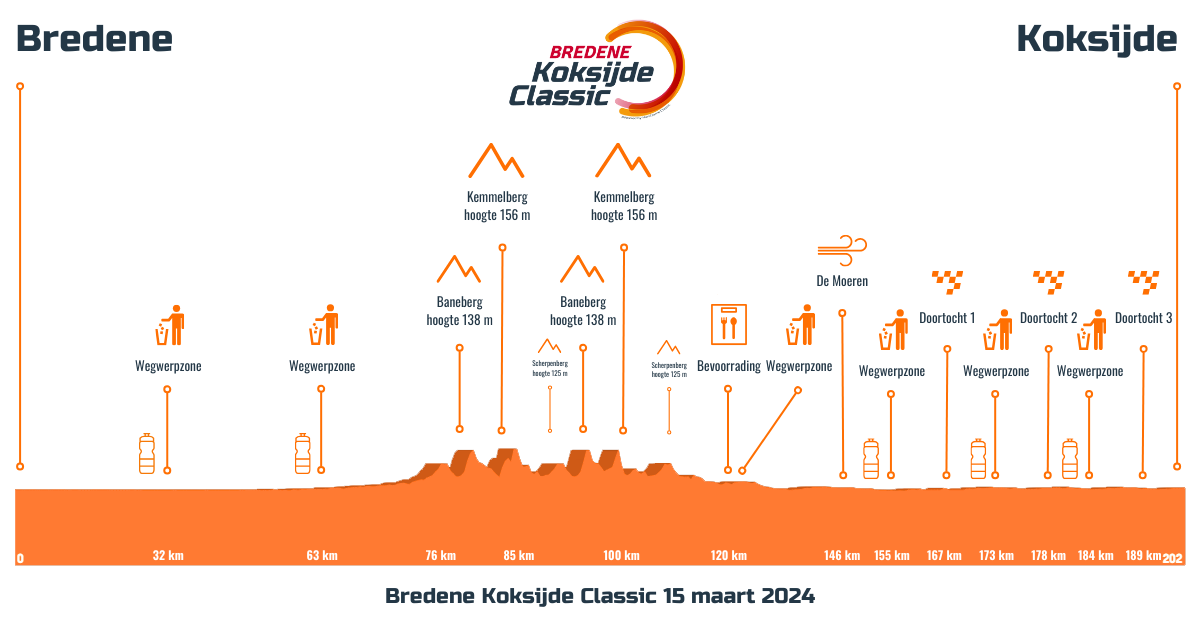 La principal novedad se encuentra en la parte central, donde habrá una colina más. Se mantiene el doble paso por el adoquinado Kemmelberg y se sustituye el Rodeberg por un doble ascenso al Baneberg. Tras ello, la carrera se dirige a De Moeren, la gran recta camino de la costa en la que el viento de costado suele generar abanicos y acabará en un circuito en torno a Koksijde al que se darán tres vueltas.