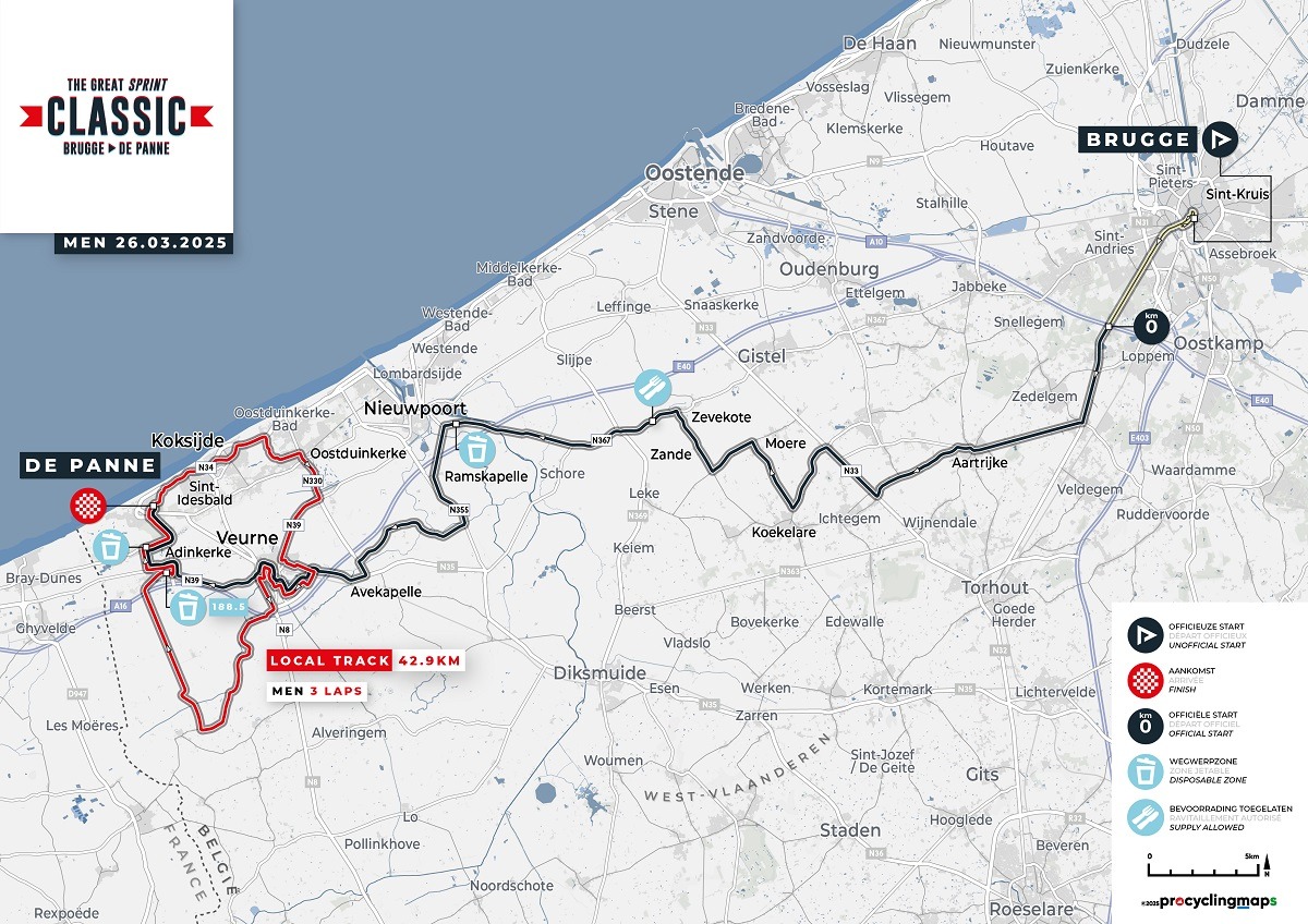 La Brujas-De Panne 2025 (1.UWT) tendrá lugar el miércoles 26 de marzo, y seguirá un recorrido tradicional, idéntico al de las últimas ediciones. Es decir, unirá las dos ciudades que dan nombre a la carrera a lo largo de 195,6 kilómetros, una vez más sin dificultades altimétricas. Tras 66,9 kilómetros desde la salida, los corredores pasarán por primera vez por la línea de meta para iniciar la primera de las tres vueltas al circuito final, de 42,9 kilómetros y caracterizado por varios cambios de dirección, carreteras estrechas, obstáculos urbanos y, sobre todo, la larga recta De Moeren. Un tramo, éste, habitualmente expuesto al viento y, por ello, posible escenario de acciones encaminadas a romper un grupo que, de lo contrario, tiene muchas posibilidades de presentarse compacto en la línea de meta y jugarse el éxito al sprint, como ocurrió el año pasado con la victoria de Jasper Philipsen, quien ganó también en 2023.
