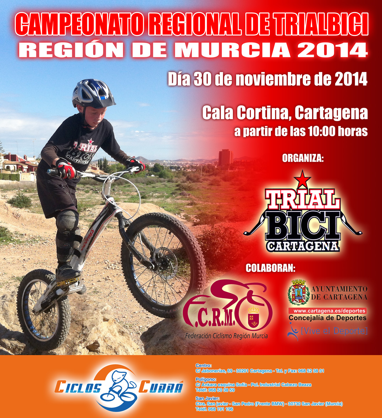 Uno de los últimos eventos ciclistas de la temporada murciana corre a cargo del Club Trialbici Cartagena. Estos apasionados de una de las modalidades más espectaculares del ciclismo se encargan de organizar el Campeonato regional de trial, que se disputará en Cala Cortina el día 30 de noviembre. El club contará con el respaldo del Ayuntamiento de Cartagena, la Federación Murciana de Ciclismo y Ciclos Currá.