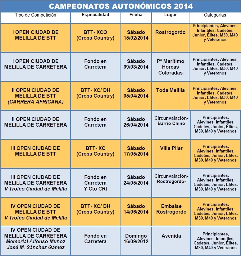 Las ocho jornadas de ciclismo estarán encuadradas en el Open Ciudad de Melilla de BTT y Open Ciudad de Melilla de carretera, según el siguiente calendario: