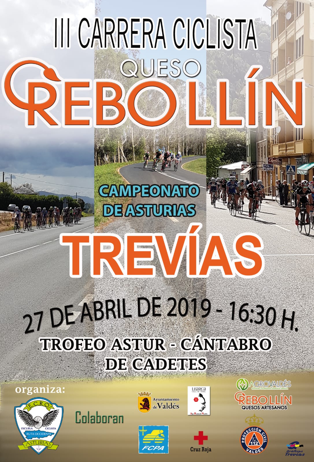 El sábado 27 de abril se disputó en la localidad de Trevías, en el concejo de Valdés, el Campeonato de Asturias Cadete ‘III Carrera Quesos Rebollín’, que fue además de la primera prueba del Asturcántabro y del trofeo Alvemaco. Los ciclistas endurecieron un recorrido ya exigente de por sí con un alto ritmo de carrera, sin tregua durante los 59 kilómetros.  Tomaron la salida 98 corredores y llegaron a meta 66.