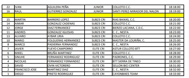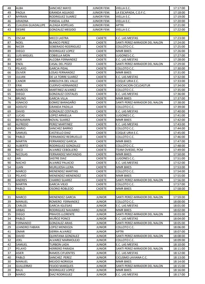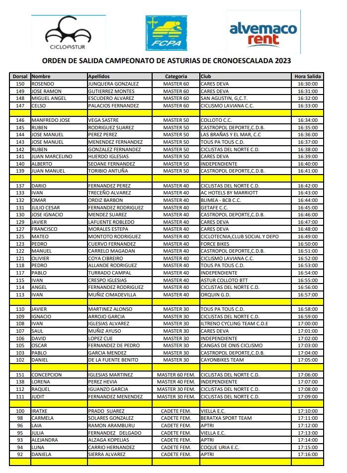 El sábado 27, se celebro el campeonato de Asturias de cronoescalada en los últimos cuatro kilómetros de El Acebo con una muy buena organización del Club Asociación Cicloastur de Cangas de Narcea, una participación de 124 ciclistas de todas las categorías. La competición dio comienzo a las 16,30, con una tarde perfecta para practicar el ciclismo, si bien amenazaba lluvia, esta no hizo aparición en toda la tarde, con una temperatura en torno a los 20 grados. Empezaron tomando la salida los Master (60-50-40 y 30), después las féminas y por ultimo los Cadetes Junior, Sub-23 y Elite.