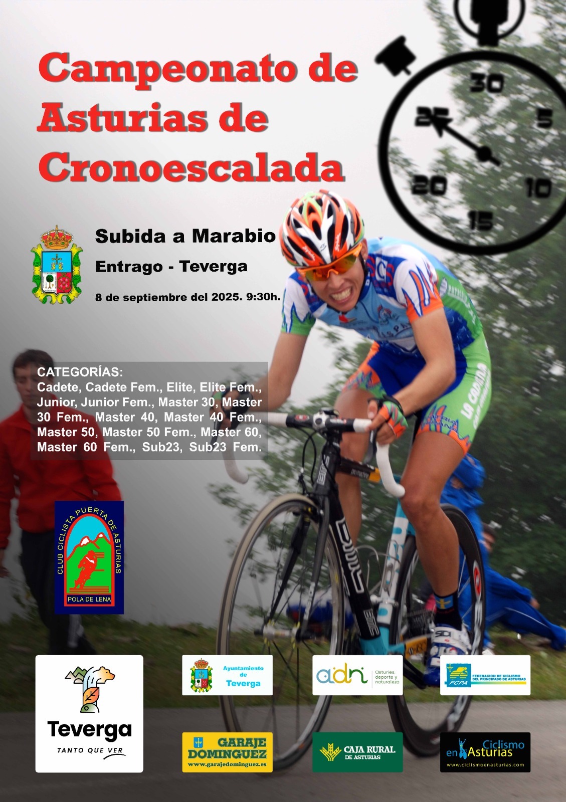 El pasado 8 de septiembre de 2025 se celebró en Entrago (Teverga) el Campeonato de Asturias de Cronoescalada, con final en la mítica Subida a Marabio, un escenario exigente que volvió a poner a prueba a ciclistas de todas las categorías.