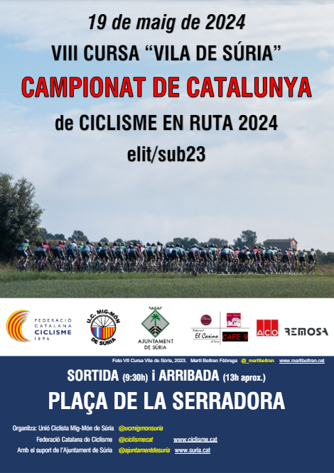 El ciclisme català prepara ja el compte enrere per la disputa del Campionat de Catalunya de ciclisme en ruta elit/sub23, que es disputarà el pròxim diumenge 19 de maig a la 8a edició de la Cursa Vila de Súria que organitza la Unió Ciclista Mig-Món Súria. El ciclisme català buscarà el relleu de Ferran Robert (elit) i Jan Castellón (sub23), que es van coronar campions de Catalunya el darrer 2023 a la Clàssica Xavi Tondo de Valls.