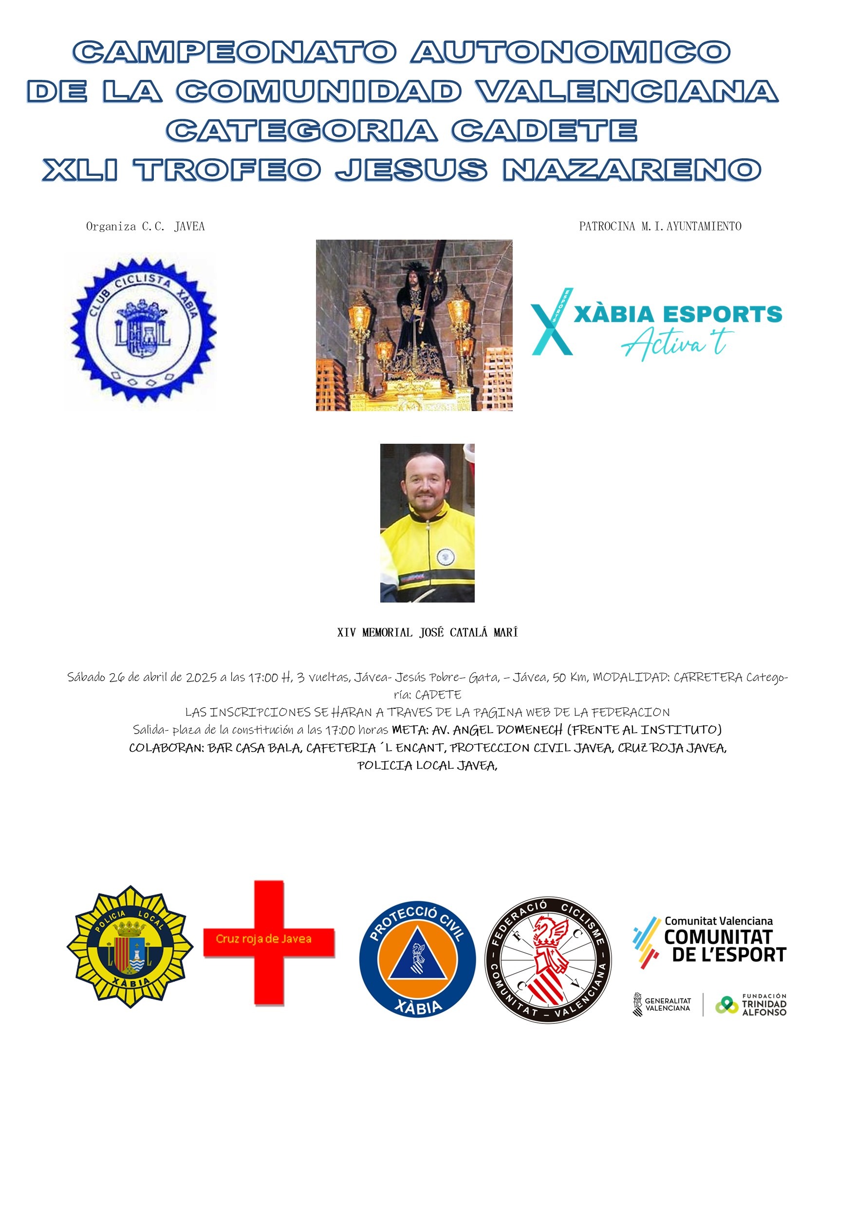 El próximo sábado 26 de abril el ciclismo de base vuelve a la localidad alicantina de Xàbia (Alicante) con la 41ª edición del Trofeo Jesús Nazareno-14º Memorial José Catalá Marí– que servirá como Campeonato de la Comunitat Valenciana para cadetes.