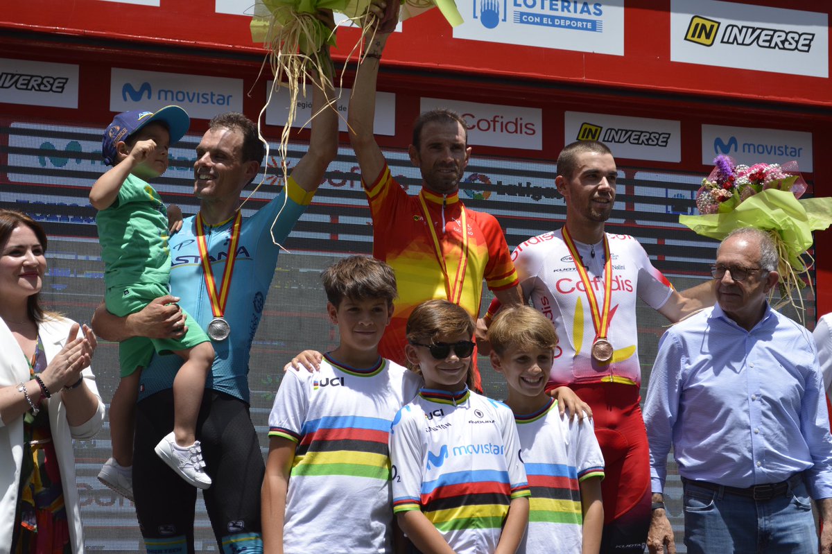 Profeta en su tierra, Alejandro Valverde (Movistar) no ha dejado escapar la oportunidad, vestido de arcoíris y en su tierra. Campeón del mundo, ya es el nuevo campeón de España cuatro años después de su último título. Y suma tres. Más fino que nunca, el murciano se ha impuesto en el Nacional de fondo en carretera sobre un recorrido de 195 kilómetros entre Los Alcázares y Murcia. Luis León Sánchez (Astana), que lo ha intentado hasta el final, se ha tenido que conformar con la medalla de plata, mientras que Jesús Herrada (Cofidis), que ha reventado el grupo en la última subida, se ha colgado el bronce.